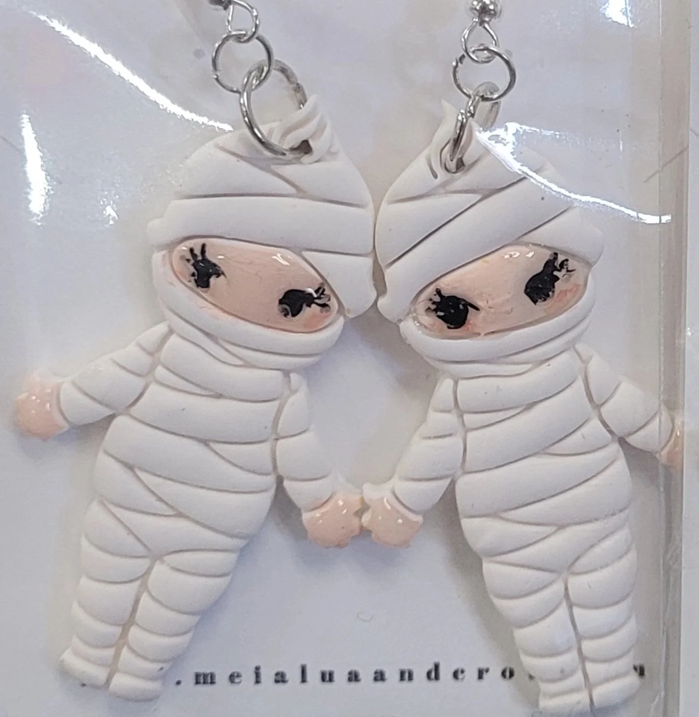 Discover our hand-painted Polymer Clay Mummy Kitsch Baby Doll earrings, a playful and unique accessory that blends whimsical charm with bold artistry. Each pair is carefully crafted with detailed hand-painting to bring these miniature mummy-themed Kitsch Baby Doll to life. Lightweight and comfortable, they add a quirky touch to any outfit, perfect for those who love statement pieces with a creative twist. Shop now to own these one-of-a-kind earrings that celebrate fun and individuality.